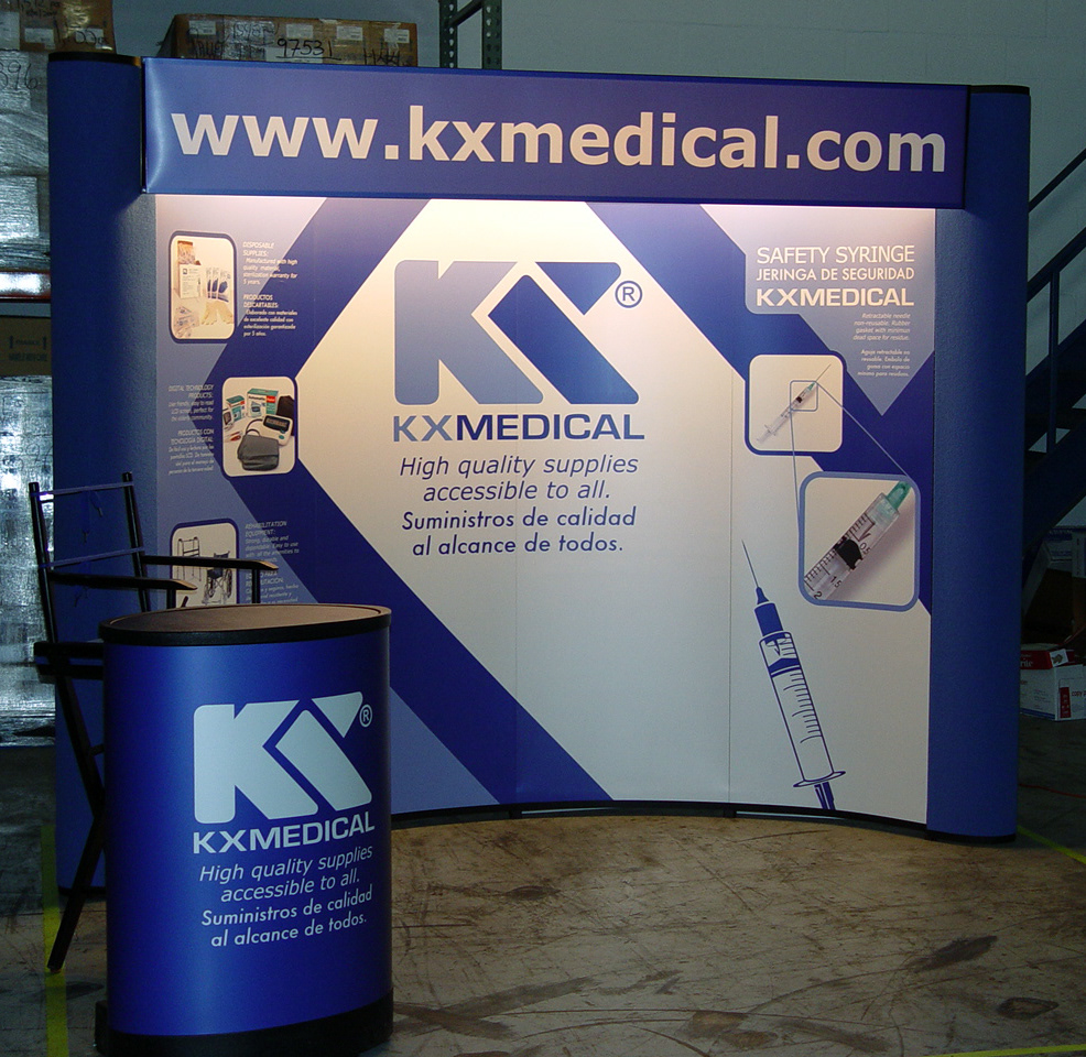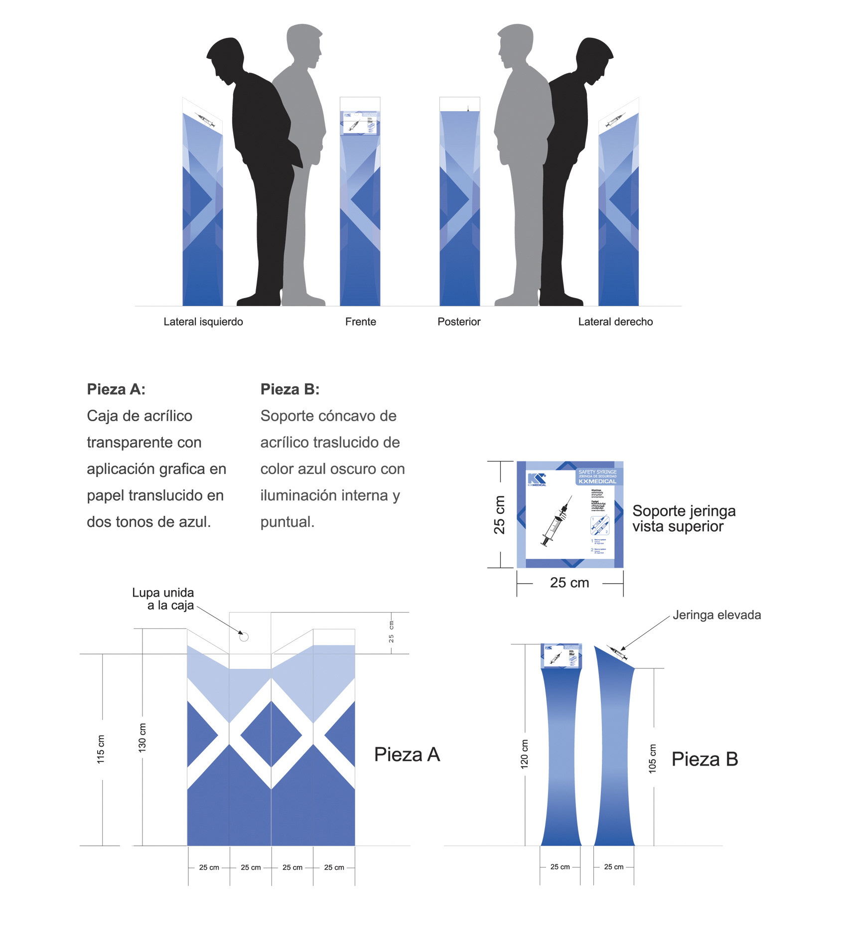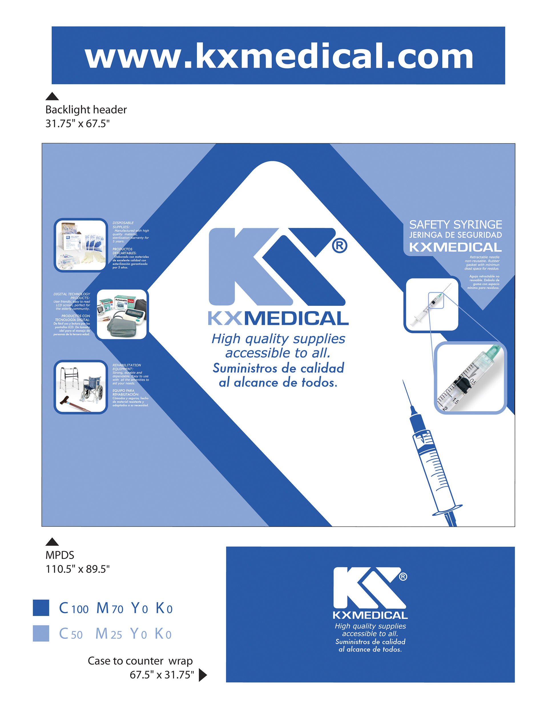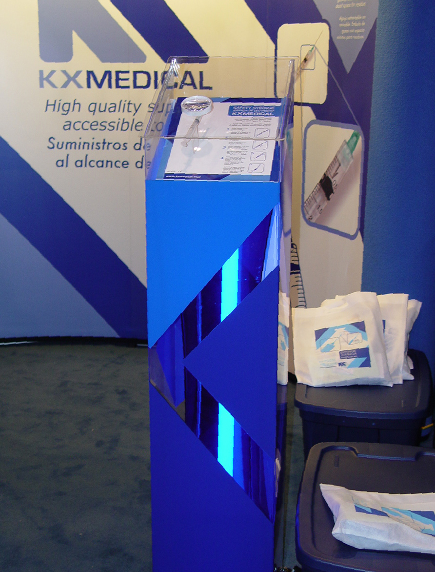 Diseño de backing y exhibidor para la marca Kxmedical. El exhibidor se elabora para el producto Jeringa de seguridad en el se destaca el detalle del producto.
